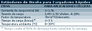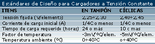 constante. Una corriente comparativamente grande se suministra durante la fase inicial de carga. Cuando la tensión de la batería alcanza un valor fijo predefinido, el cargador cambia de carga a corriente constante a carga a tensión constante, con una disminución en la corriente de carga. Los valores indicados en la tabla de abajo deberían tomarse como los estándares de diseño. Para aplicaciones cíclicas de carga debe interrumpirse al completarse un tiempo predeterminado de carga.
