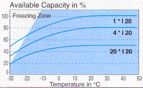 The nominal capacity of solar batteries is given at the 100 hour rate, C100 (final discharge voltage 1.85 V/cell) and the series A 500 C nominal capacity is given at the 5 hour rate, C5 (final voltage 1.7 V/cell). The capacity of valve regulated lead-acid batteries depends on the temperature and the output current (cf. fig. 2). Discharge within the electrolyte-freezing zone could lead to destruction of the battery. The final discharge voltage and discharge times, as well as the characteristic currents can be taken from the discharge curves in the brochures on the respective series. The discharge curve for the A 500 is given below as an example (cf. fig. 5). With currents lower than I20 or I10 the battery output can exceed the nominal capacity. With currents higher than I20 the battery output is lower than the nominal capacity.