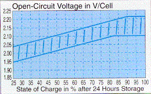 The open-circuit voltage potential can only be measured on stored batteries. This means : the open-circuit voltage potential can only be determined after a storage period of at least 2,4 hours and not immediately after charge or discharge. The open-circuit voltage potential depends on the state of charge and the temperature.