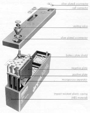 Valve regulated lead-acid batteries are distinguished by the immobilised electrolyte and the vented casing. Each battery cell has a valve through which any resulting hydrogen gas (due to excess pressure in the cell) can be released (typical value: 100 mbar , 114 PSI). The valve closes airtight to external pressures. After release of the hydrogen the valve closes again and prevents 02 entering the cell. The sealed lead-acid batteries are maintenance free for three reasons: