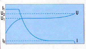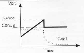During the discharge of lead-acid batteries the acid density decreases giving a low conductivity for deep discharged batteries. This effect is compensated for in dryfit batteries by additives to the electrolyte which increase conductivity. A surplus volume in the plates is formed by increased lead sulphate formation, which represents a mechanical load for the system. dryfit batteries are constructed to withstand the increased load largely without damage. Deep discharge should be avoided. Sulphation of the plates con also occur if the batteries are discharged with discharge currents < 0,2 . I20. The batteries can then only be charged with a suitable charge process e.g. a charge with the IUI-characteristic (cf. fig. 8).