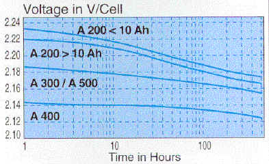 4.6 Discharge Voltage The discharge voltage is the battery voltage during the discharge process. As an example figure 5 shows the discharge curves for various discharge currents for the A 500. The diagram shows the time during which the respective current can be drawn, the battery discharge voltage and the final discharge voltage at the discharge current.