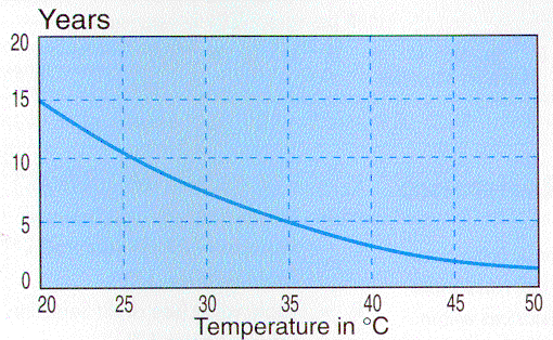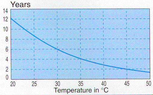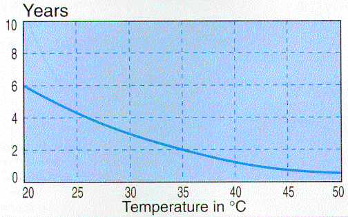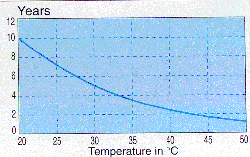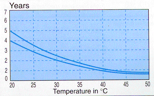 The service life for dryfit batteries in constant charge operation, is the period of time after which the battery has only 80% of its nominal capacity C20 i.e. C10. This is valid for discharge at I20 up to UE = 1.75 V/cell i.e. I10 up to UE = 1,8 V/cell at room temperature. The service life of the battery is an important factor for the standby parallel operation. The service rife of the battery depends on the temperature and can only be reached if the given charge voltage is adhered to. The diagrams show the service life in relation to the temperature. Other parameters with influence on the service life are :
